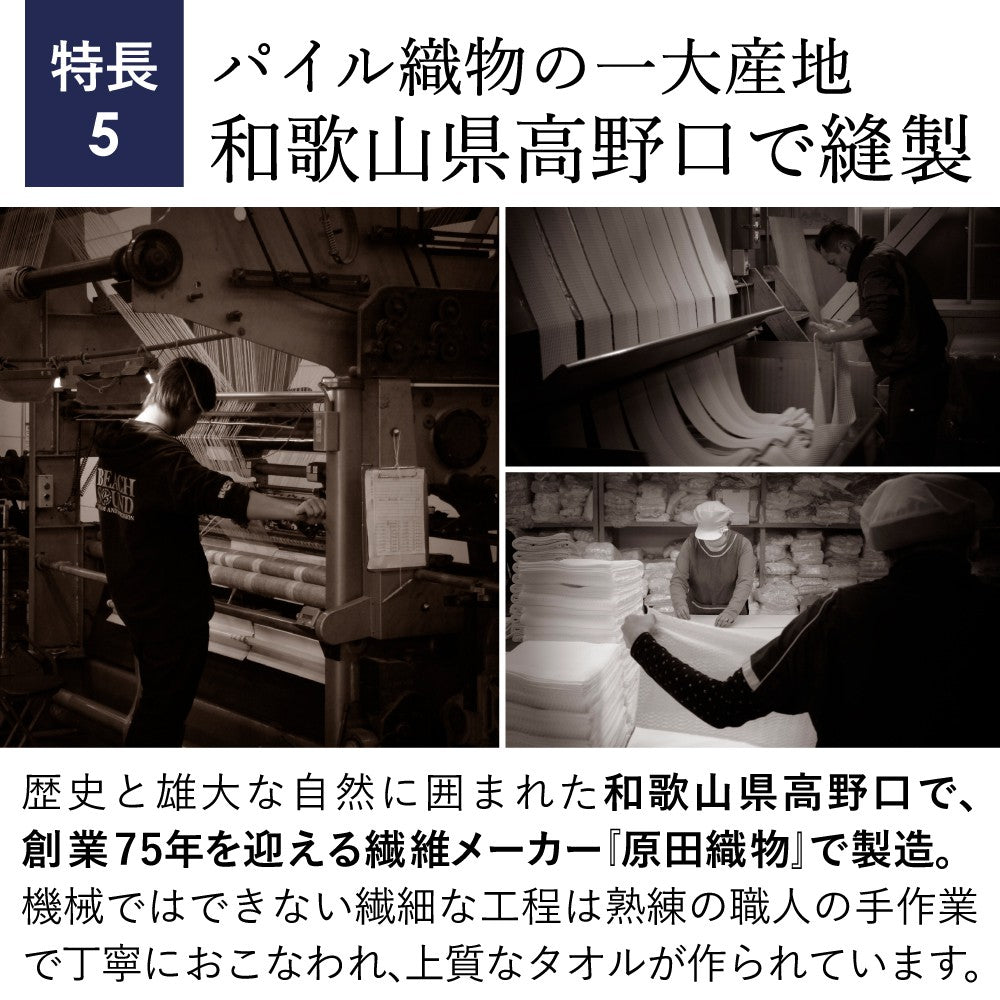 内側のパイル生地が高い吸水力を発揮し、ゴシゴシせずふわっと抑えるだけでもしっかりと吸水。凸凹が少なく肌刺激が少ないので、赤ちゃんや敏感肌の方にもオススメです。